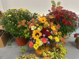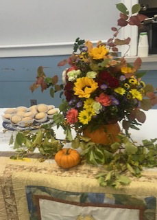 meeting and was attended by 50 members and guests. Head hostess Nancy Kelly and her crew provided a plentiful buffet of sandwiches and desserts, and the buffet table was completed by a beautiful fall arrangement by Maria Holster. Using fall colors and orange roses, the buffet arrangement matched perfectly with the table arrangements by Mary Cassidy, who also utilized orange roses, seated in small pumpkins and accompanied by varied smaller flowers in several other fall colors.