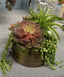 Our own member, Jo Costello, used a pumpkin as a base for a beautiful fall-themed buffet table arrangement. Pat Artis continued the fall theme with individual table arrangements in containers decorated with leaves and vines and filled with colorful autumn flowers.