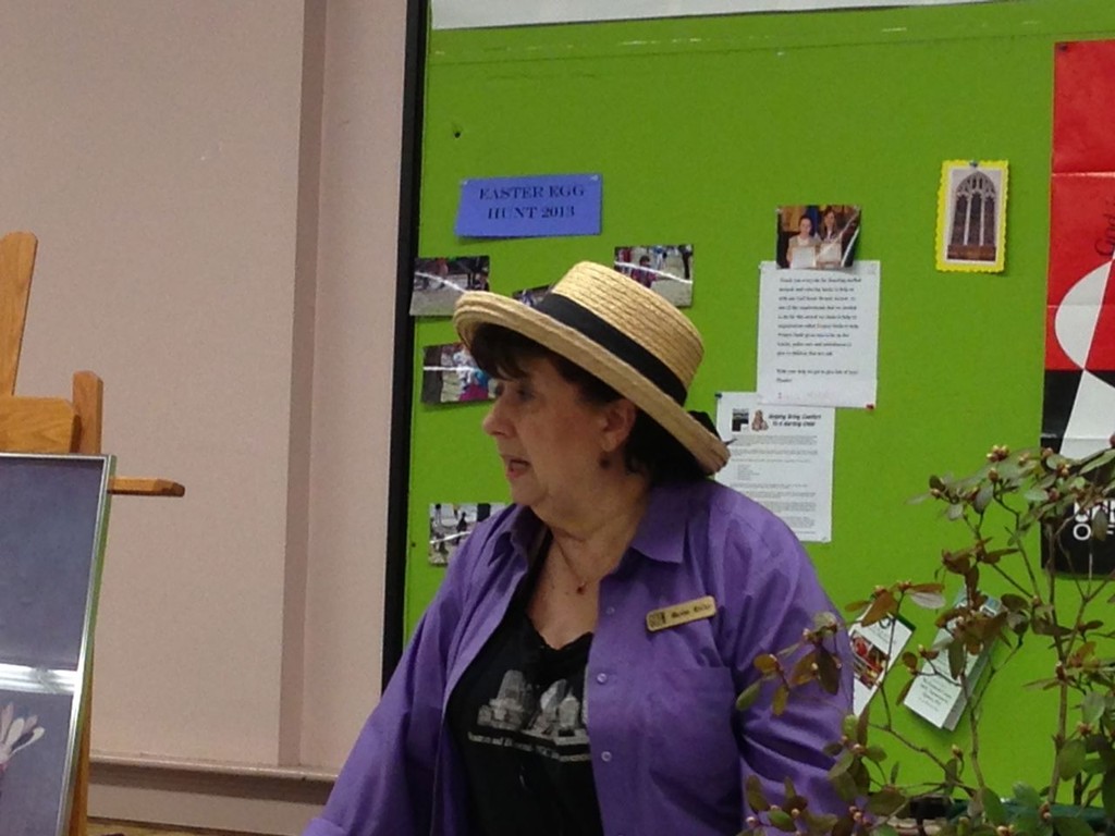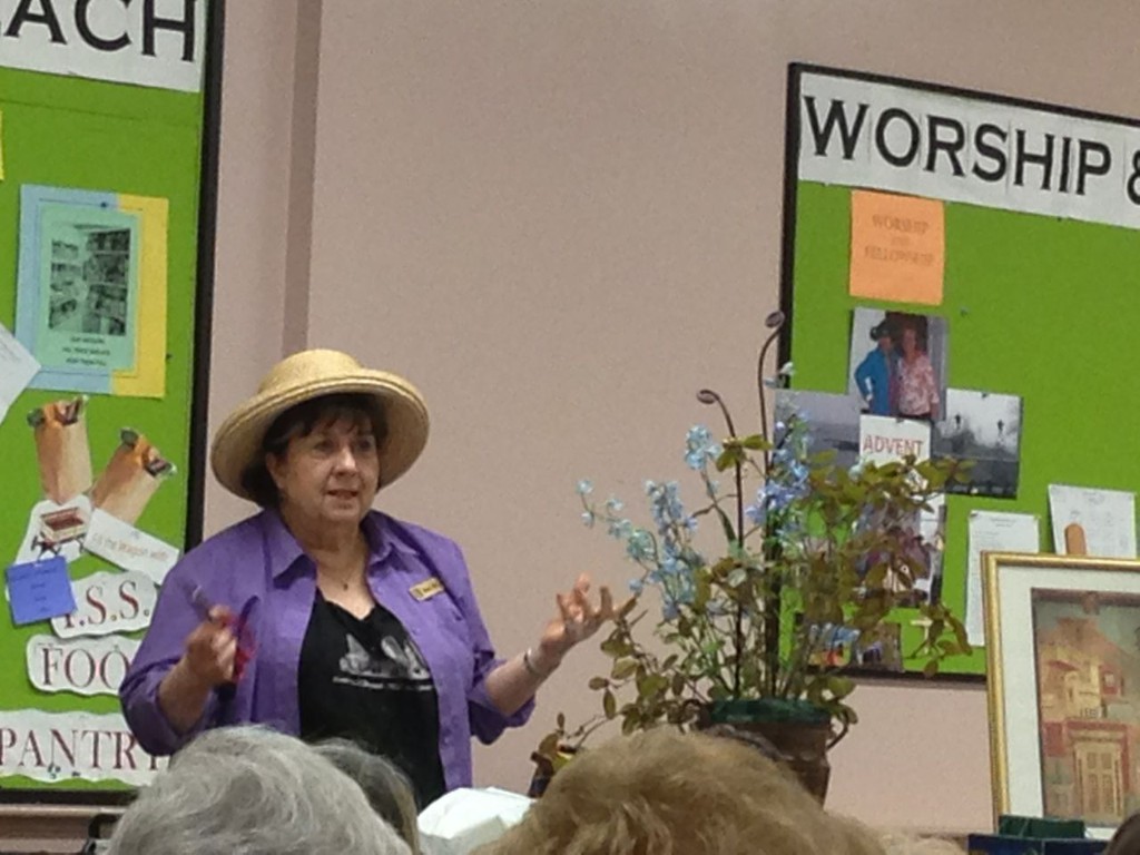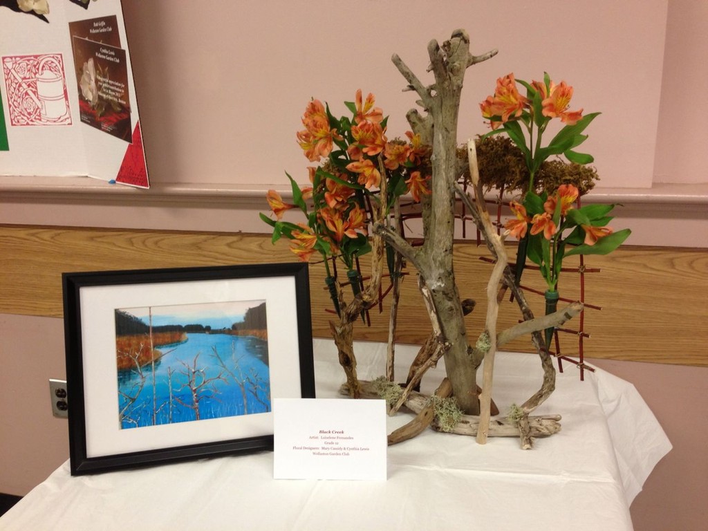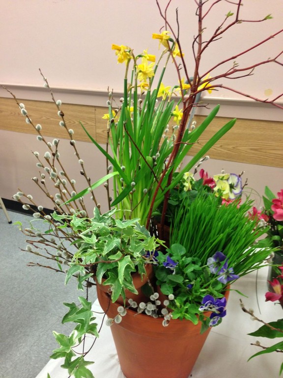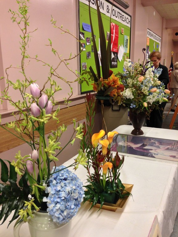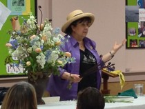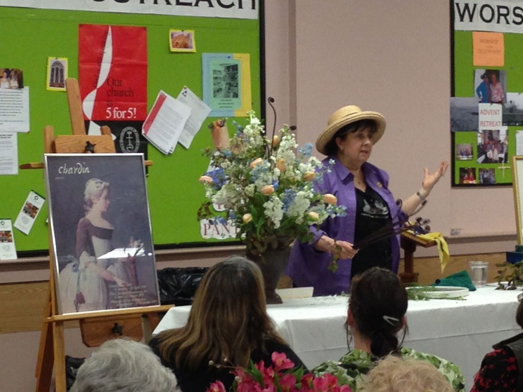 Marisa McCoy a Master Flower Show School Judge and noted floral arranger, presented a wonderful program and demonstration on ‘Art in Flowers’. Marisa is a long-time MFA Associate in floral arranging and participates annually in the museum’s Art in Bloom. Marisa combined six works of art with original floral interpretations and designed floral arrangements to complement each art piece. McCoy stressed that the art work should be interpreted, not explained – she warned against being “too literal” in creating the floral piece. McCoy stressed that finding the relationship between color, texture and/or line in the art work should be the focus when creating an arrangement to interpret the art. As always the importance of the right container, perfect flowers, and good technique make for a success with “Art in Flowers’. McCoy is a wonderful teacher and everyone in the room benefited from her instruction.