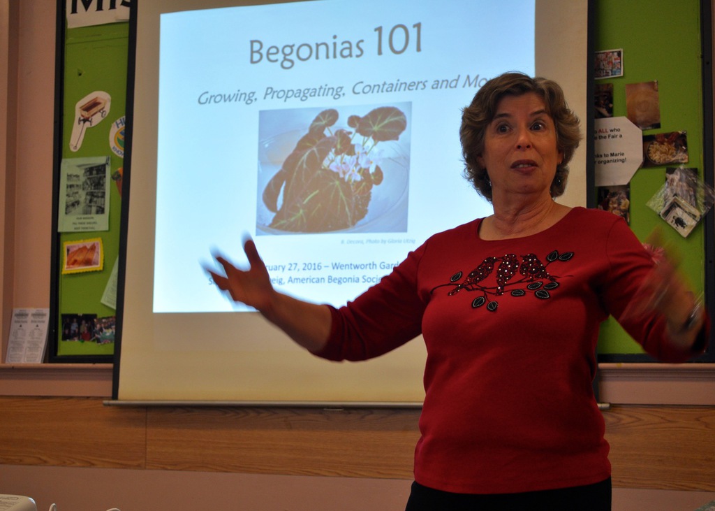 Sharon Rosensweig presented "Begonias in All Their Diversity" Sharon is President of the Buxton Branch of the American Begonia Society, meeting the first Saturday of the month at The Goodnow Library in Sudbury. Sharon, a two time Libby Stevenson Award winner for Best Specimen Plant Grown Under Lights at the Boston Flower Show, brought a variety of her begonias to view.